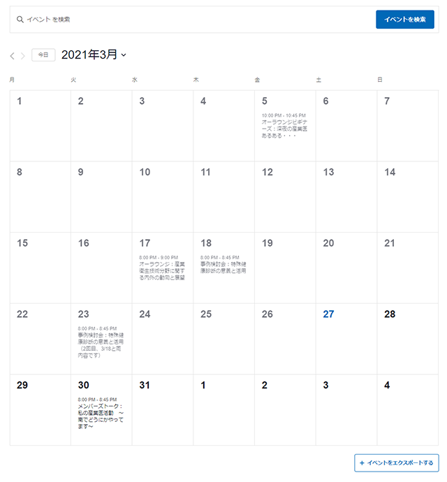 パソコンでイベントページにアクセスすると、当会が主催するイベントをカレンダー形式でご確認頂けます。スマートフォンでのアクセス時はリスト形式で表示されます。