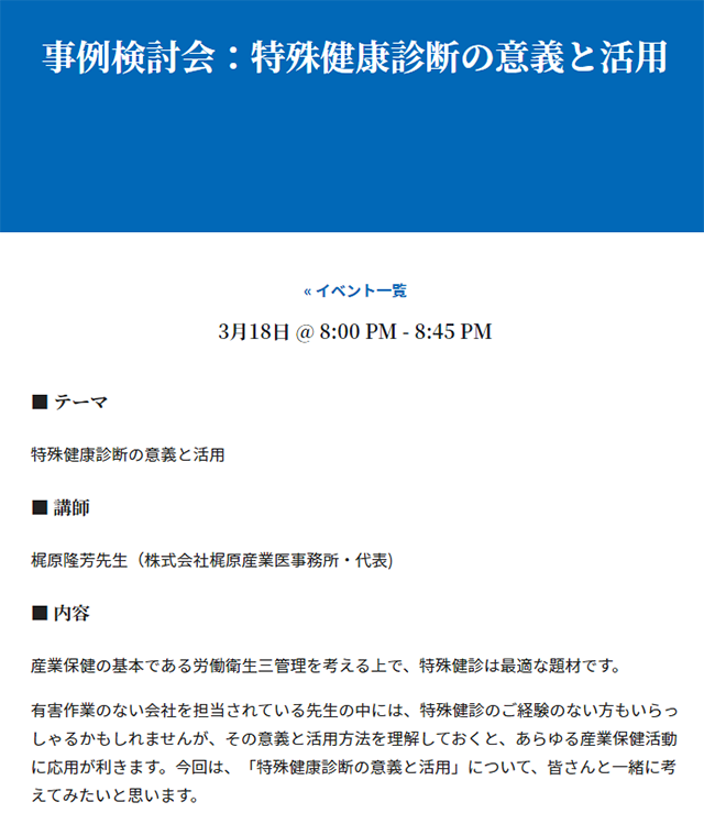 学習動画に関する意見交換や、各イベント種別、事例相談、地域別の産業医コミュニティといったフォーラムが用意されています。当会が提供する各種オンラインサービスに関する意見交換や、産業医同士の交流にお役立てください。