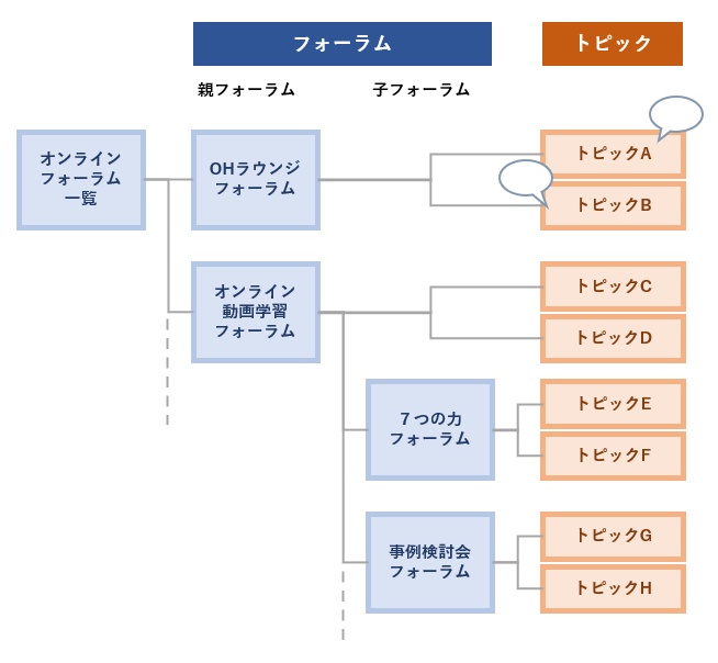 本オンラインフォーラムにおける会員同士の交流は、各フォーラムに「トピック」を投稿するか、既に投稿されている「トピック」に対して「返信」することで行います。