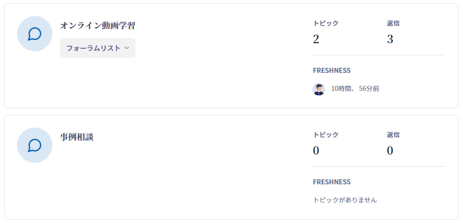 例えば、オンライン動画学習についてのコミュニティスペースは、「オンライン動画学習フォーラム」があります。