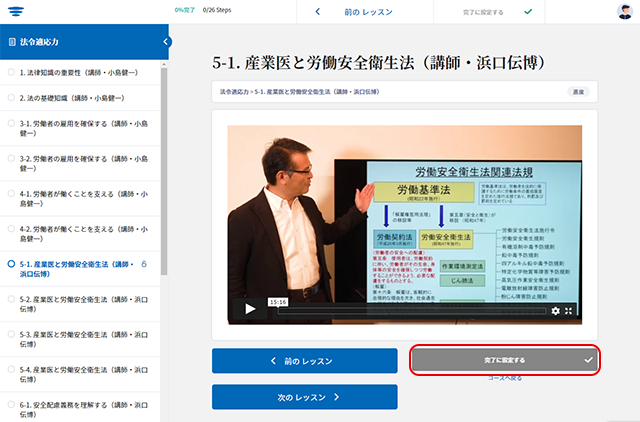 視聴を終えたレッスンは、再生画面下にある「完了に設定する」をクリックすることで、学習済みとして記録できます。